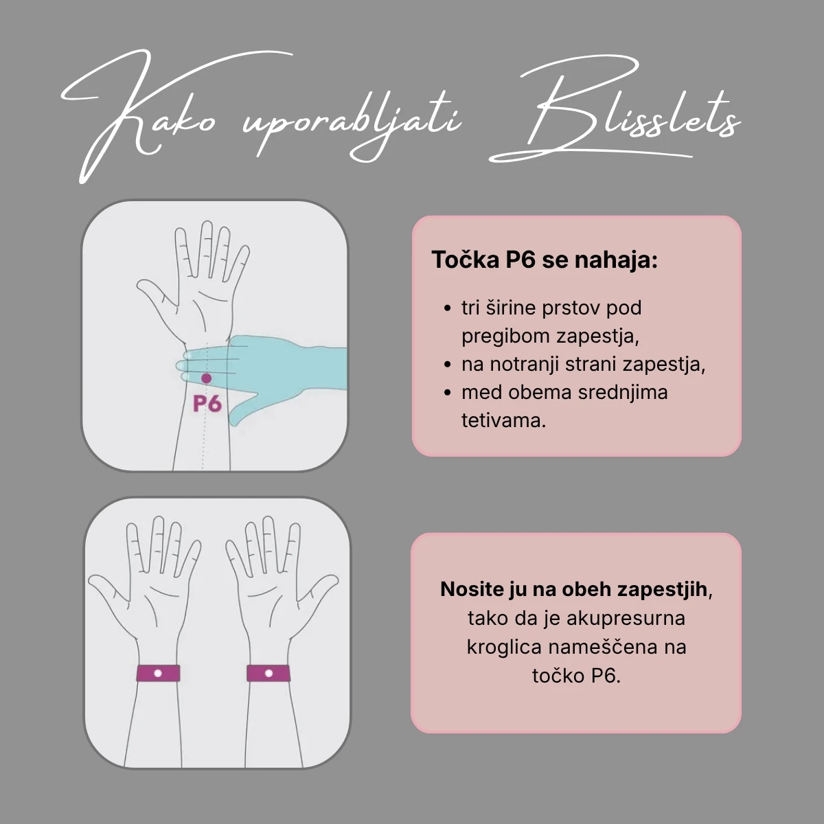 Kroglico namestiš na akupresurno točko P6, ki se nahaja tri širine prstov pod gubo zapestja, tik med obema tetivama na spodnji strani zapestja. Blisslets so v dveh osnovnih oblikah: bodisi kot elastike same ali kot elastike z usnjenimi prevlekami. V obeh primerih se mora elastični del občutiti prijetno, a udobno.