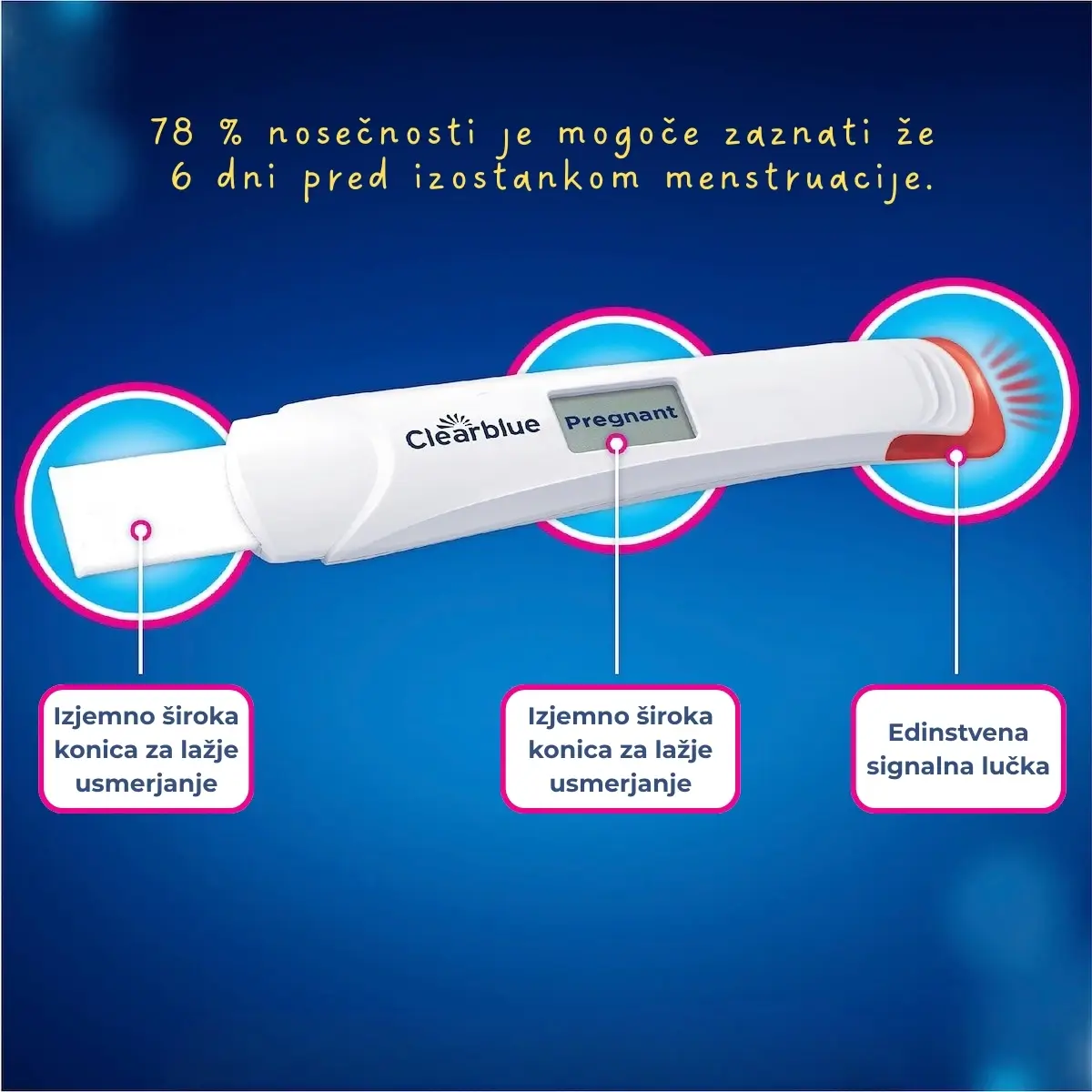 Clearblue Digital Ultra Early test nosečnosti omogoča testiranje že do 6 dni pred izostankom menstruacije. Digitalni rezultat “Pregnant/Not pregnant” in več kot 99 % zanesljivost od dneva pričakovane menstruacije.